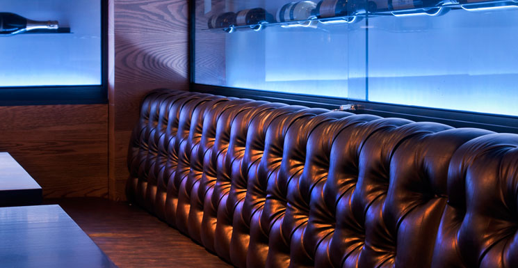 The design solution employs banquette seating around the perimeter of the room with leather upholstery, deep diamond buttoning in a burgundy colour which compliments the blue lighting creating a dramatic pallette and gives the bar a feeling of refinement and distinction.